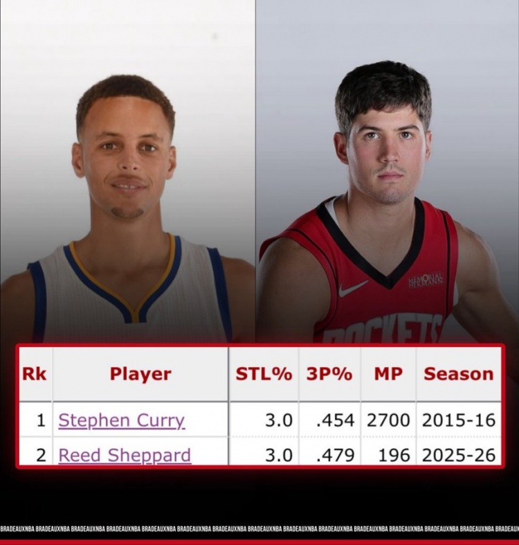 Tỷ lệ bắn ba điểm của Shepard cho đến thời điểm này trong mùa giải này là 45+% và tỷ lệ cướp của anh ấy là 3+%. Chỉ có 16 Currys đã làm được điều này trước đây.
