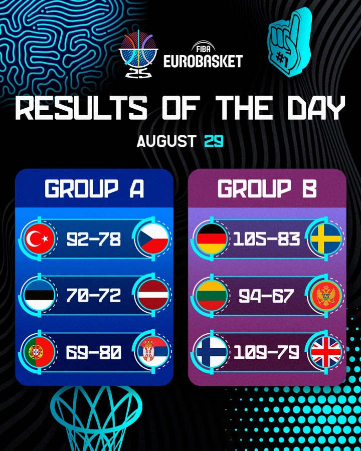 Giải vô địch châu Âu của đội bóng rổ nam sẽ kết thúc vào ngày thứ ba. Các kết quả như sau: