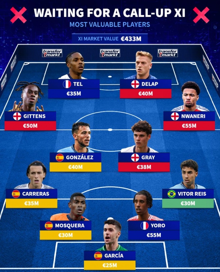 "Thị trường chuyển nhượng" đếm các đội hình đắt nhất của những người chơi chưa giành được cuộc gọi của đội tuyển quốc gia, với Tây Ban Nha và Anh được liệt kê ở mức 4.