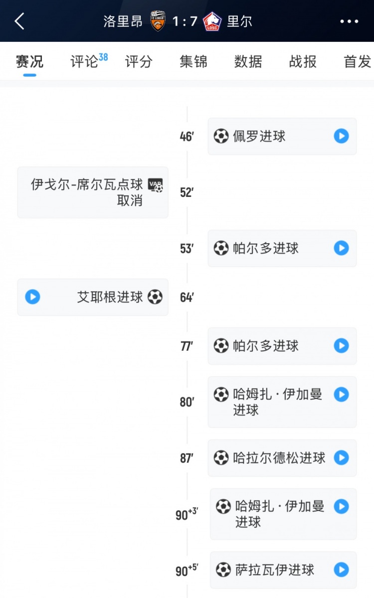 7-1 thất bại trước Lorient & và ghi tất cả 7 bàn thắng trong hiệp hai. Lille là đội đầu tiên ở Ligue 1 kể từ năm 1997